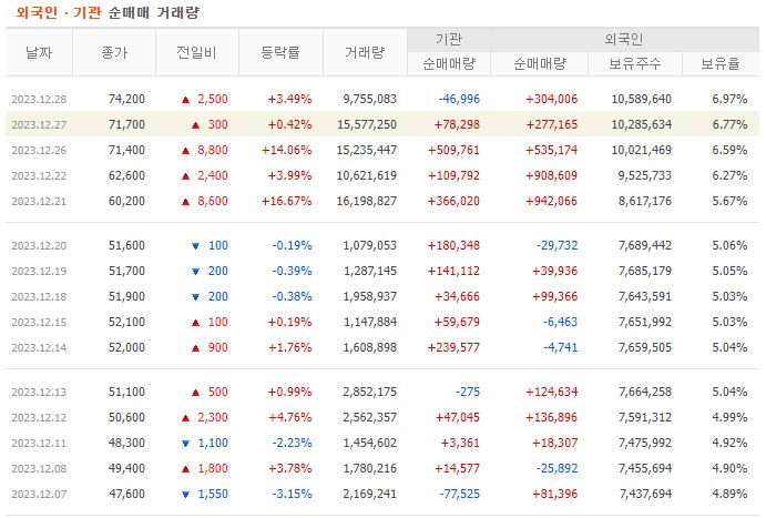 2023년에는 포스코DX가 급등하자 개인들은 매물을 솓아냈고, 외인과 기관은 매수를 통해 상승을 견인했다.