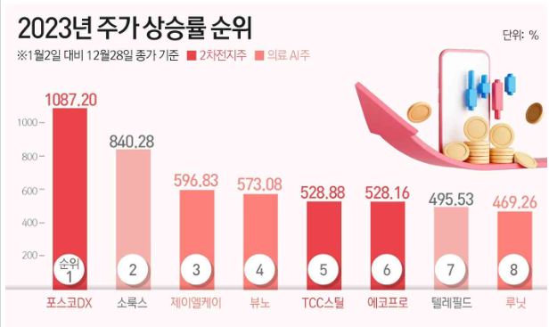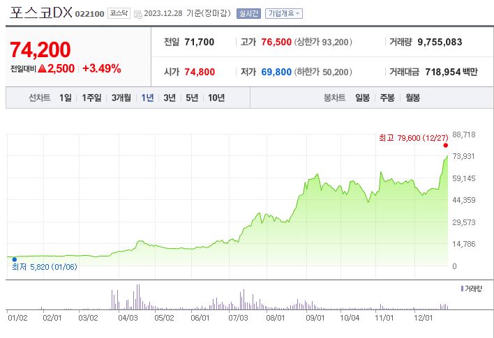 2023년 국내 증시에서 가장 많이 오른 종목이 포스코DX이다.