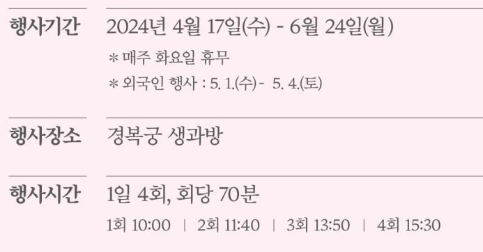 2024년 경복궁 생과방 예약 정보를 알려드립니다. 예약은 필수니 참고하세요. 예약 정보 먼저 보세요.경복궁 생과방 사전 예약하기 2024 경복궁 생과방 예약 필수 티켓예매오직 경복궁에서만 맛